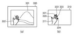 手領域検出部105は例えば特許文献1と同様の方法により、赤外線画像からユーザの手領域を抽出することができる。具体的には、撮像部104は赤外線カメラであるため、ユーザの手領域からの放射光を測定し、温度が所定の範囲(人間の体温の近傍である30℃〜34℃程度)にある被写体だけを抽出する。そのため、撮像画像にはユーザの手領域のみが写る。手領域検出部105は、撮像部104から供給される撮影画像データに対して、ノイズ除去処理などを行った後、手領域および手の指先位置をパターンマッチングにより検出する。図3(b)は図3(a)の状態で撮像部104が撮像した画像310から検出された手領域311と指先位置320〜324を示している。  The hand