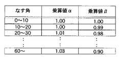 次に、CPU22の閾値決定部22eは、ステップS60にて、ハードディスク27に格納されている「なす角−乗算値」閾値テーブルデータより、求めたなす角θiに対応する乗算値αi、βiを抽出すると共に、閾値のデフォルト値(T1(0),T2(0))をハードディスク27から取得し、閾値のデフォルト値T1,T2と乗算値αi、βiをそれぞれ乗算した値T1(i)(=αi×T1(0)),T2(i)(=βi×T2(0))を求める。  Next, in step S60, the threshold