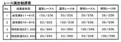 一方、図3において、レース演出制御手段520には、レース演出画像抽選手段521と、レース結果画像抽選手段522とが含まれている。このようなレース演出制御手段520に対応して、画像記憶手段530には、レース演出画像データ記憶手段534が含まれている。このレース演出画像データ記憶手段534には、図示しないが、通常レースA,B及び特別レースA,Bといった4種類のレース演出の連続画像が記憶してある。これらレース演出画像としては、勝敗が決定される勝負演出であれば内容は特に限定されるものではなく、例えば、マラソン等の陸上競技、水泳競技、自転車レースや自動車レース、架空の乗り物や環境で行われる空想上の競技又はレース等であってもよい。 On the other hand, in FIG. 3, the race effect control means 520 includes a race effect image lottery means 521 and a race result image lottery means 522. Corresponding to such race effect control means 520, the image storage means 530 includes a race effect image data storage means 534. Although not shown, the race effect image data storage means 534 stores continuous images of four types of race effects such as the normal races A and B and the special races A and B. The content of these race performance images is not particularly limited as long as it is a game production in which victory or defeat is determined. For example, in race events such as marathons, swimming competitions, bicycle races, car races, fictional vehicles and environments. It may be an imaginary competition or race to be held.
