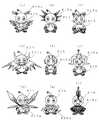 さらに、図17(a)〜(d)に示した4種類の特別形態キャラクター画像821〜824も、全て図15(a)の基本キャラクター画像800に、構成要素画像821a〜829aを組み合わせたり、基本キャラクター画像800の色彩を変えたりして形成したものである。これら特別形態キャラクター画像821〜824を形成するにあたっては、基本キャラクター画像800と形態上の共通性が少なくなるように、特に、多くの構成要素画像821a〜849aを付加するとともに(なお、図17では代表的な1つの構成要素画像にのみ符号を付してあり、図17には符号を付していない他の構成要素画像も含まれている)、ベースとなる基本キャラクター画像800の色彩を全体的に変更している。これにより、特別形態キャラクター画像821〜824が、基本キャラクター画像800と異質であって特別な形態に成長したことを演出している。  Furthermore, the four types of special-form character images 821 to 824 shown in FIGS. 17A to 17D are all combined with the