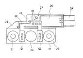 また、コ字形状をしたFPC(Flexible Printed Circuits)基板28は、図6に示すように、両脚部の先端で歪ゲージG1,G2に起歪体20の両端部と中央部との各間で接続され、該FPC基板28の中間部にはFPC基板28の配線パターンに接続する4つのスルーホール46が設けられ、これらのスルーホールは前記アンプ基板の端子59に夫々接続されている。  Further, as shown in FIG. 6, the U-shaped FPC (Flexible Printed Circuits)