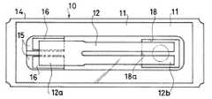図3には、第1実施例の音叉型水晶振動子の変形例が示されている。この変形例は、矩形をなす凹部18の各隅部18bがそれぞれ丸みを付けられている点において第1実施例と異なる。これにより、比較的硬質のセラミックからなる上側薄板部材13aに凹部を加工する際、及び水晶振動子の組立時・使用時に、隅部への応力集中が緩和されて割れ等の破損が防止されるので、凹部18の加工が容易になり、かつバッケージ構造の強度が向上する。本変形例の凹部18も、上記第1実施例と同様に、前記振動片の基端部12a側から自由端部側12bに向かう長手方向に沿って直線状に延長する直線状辺部分と、該長手方向に直交する向きに直線状に延長する直線状辺部分とで構成される平面矩形の開口を有する。FIG. 3 shows a modification of the tuning fork type crystal resonator of the first embodiment. This modification differs from the first embodiment in that each