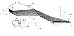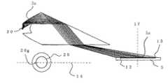 更に、光源1から発せられ、照射系照射軸14近傍より下側に大きな角度で射出した一部の光束はプリズム入射面34で屈折し、第2の反射光学系4を介して、被照射物体5を照射する。その際、屈折光学系2から一番離れた発光点24からの光束(実線)24a及び一番近くの発光点25から発せられた光束(点線)25aは第2の反射面4aの入射面両端10、11を通る光線として表されている。これらの光束24a、25aは図4に示すように被照射物体5の照射範囲5aの端部12、13を通る。  Further, a part of the light beam emitted from the