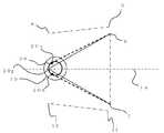更に、図2Dに示す如く光源1から発せられ,照射系照射軸14近傍より第二の側(この場合下側)の発光点27から大きな角度で射出した一部の光束は第3の光学系としての第2の反射光学系4を介して、被照射物体5を照射する。その際、図2Aに示す如く発光点24からの光束(実線)24a及び図2Bに示す如く発光点25から発せられた光束(点線)25aは第2の反射光学系4の入射面両端10、11を通る光線として表される。これらの光束24a、25aは、図1に示すようにそれぞれ被照射物体5の照射範囲5a全面を照射する。  Further, as shown in FIG. 2D, a part of the light beam emitted from the