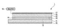 また、偏光板16の内側には、光学補償フィルム(図示略)を配置してもよい。光学補償フィルムを配置することで、入力機能付液晶表示装置1を斜視した場合の液晶層13の位相差を補償することができ、光漏れを減少させてコントラストを増加させることができる。光学補償フィルムとしては、負の一軸性媒体と正の一軸性媒体とを組み合わせたものや、各方向の屈折率がnx>nz>nyである二軸性媒体が用いられる。The