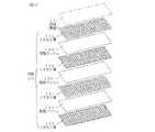 樹脂フィルムを挟まずにCFRP層だけ重ねるFRP構造では、図8に示すように各CFRP層の炭素線維クロスの縦糸と横糸の交点の位置が重なっている場合と、図9に示すように各CFRP層の炭素線維クロスの縦糸と横糸の交点の位置がずれている場合とでは、後者が前者より薄くなる。後者の場合には、炭素線維クロスの縦糸と横糸の交点が、縦糸も横糸もない隙間位置に入り込むからである。そして、後者のように薄くなると、前者のような剛性が得られなくなる。しかし、クレードル10の上面では、被検体Kの体重が小面積の部分に集中してかかることはないので、支障を生じない。  In the FRP structure in which only the CFRP layer is stacked without sandwiching the resin film, the position of the intersection of the warp and the weft of the carbon fiber cloth in each CFRP layer overlaps as shown in FIG. 8, and each CFRP as shown in FIG. In the case where the position of the intersection of the warp and weft of the carbon fiber cloth of the layer is shifted, the latter is thinner than the former. This is because, in the latter case, the intersection of the warp and weft of the carbon fiber cloth enters the gap where there is no warp or weft. And if it becomes thin like the latter, rigidity like the former cannot be obtained. However, on the upper surface of the