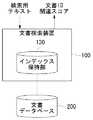 文書検索装置100のインデックス保持部130は、各文書ファイルを検索するためのインデックス情報を保持する。インデックス情報については後に詳述する。文書検索装置100は、検索用テキストとインデックス情報に基づいて、コーパスから文書ファイルを検出し、検索用テキストとの内容の関連性を「関連スコア」として指標化する。文書検索装置100は、所定数、たとえば、関連スコアが上位20位以内の文書ファイルの文書IDと、その関連スコアを画面表示させる。こうして、文書検索装置100のユーザは、任意の検索用テキストに対して、内容の関連性が高い文書ファイルをコーパスから探し出すことができる。  The