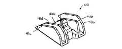 駆動スレッド40およびカートリッジ42の具体的な構成は、エンドエフェクタ16の具体的な構成により変更できるが、典型的な実施形態では、図8Aに示されるように、カートリッジ42は、複数の直線状のステープル列を取り付け、ステープル列の間に延びる切断部を形成してステープル留めされた組織を分離するように構成されている。具体的には、カートリッジ42は、第1の顎部18に形成されたチャネル内に着脱可能に配置できるほぼ細長いハウジングの形態である。ハウジングは、このハウジングに形成された、いくつかの、例えば6列のステープル収容スロット44の直線状の列を含み、各スロットの中にステープルを収容している。いくつかの駆動部材(不図示)が、ステープルを支持し、ステープルをステープル受容スロット44に通すためにステープルの下に配置されている。駆動スレッド42は、図8Bにより詳細に示されており、いくつかの、例えば4つの直立部材41a、41b、41c、41dが駆動スレッド42に形成され、くさび形状の構成を有している。スレッド40が端部カートリッジ40を通して遠位方向に前進されると、直立部材41a−dが駆動部材に当接し、駆動部材をアンビル20の方へ向かって上へと移動させ、これにより、ステープルをアンビル20の方へ押し動かす。駆動スレッド40はまた、中央部材を含み、この中央部材はカートリッジの中央を通って延びており、この中央部材に形成された、ステープル留めされた組織を切断するためのブレード40bを有する。  The specific configuration of the