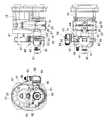 そして、中間軸25のスプライン歯29には、クラッチ部材としてのスリーブ状のクラッチ35がスプライン結合されて、中間軸25と一体回転可能且つ前後方向へスライド可能となっている。このクラッチ35の前面には、第2ギヤ30の後面に設けられた係合爪38,38に係合可能なクラッチ爪36,36が形成される一方、後面には、ボススリーブ31の前面に設けられた係合爪39,39に係合可能なクラッチ爪37,37が形成されて、前後のスライド位置により、第2ギヤ30及びボススリーブ31との一方又は双方と係脱可能となっている。すなわち、前進位置では第2ギヤ30のみと係合して中間軸25と回転方向で一体化させ、後退位置ではボススリーブ31のみと係合して中間軸25と回転方向で一体化させ、中間位置では第2ギヤ30及びボススリーブ31の双方と係合して中間軸25と回転方向で一体化させるものである。40は、クラッチ35の外周面で中央部に周設された被係合部としてのフランジである。  A sleeve-