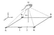 図3−1及び図3−2は、個人差による反射光強度のばらつきを説明するための図である。図3−1では、LCDパネル2の表示面中央部において、表示面と平行(x−y方向)に手H1をかざした状態を示している。また、図3−2では、LCDパネル2の表示面中央部において、手H1のサイズより大きな手H2を、y軸を基準に左方向に傾け且つx軸を基準に手前方向に傾けた状態を示している。なお、図3−1及び図3−2において、LCDパネル2と手との離間距離Dは同等であるとする。  FIGS. 3A and 3B are diagrams for explaining variations in reflected light intensity due to individual differences. FIG. 3A shows a state in which the hand H1 is held in parallel with the display surface (xy direction) at the center of the display surface of the