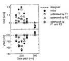 図21に、半導体装置に、本方法を適用した場合に、測定された電気的特性の例を示す。図21で、黒丸は、補正前の例の特性の例である。また、矩形のマークは、パラメータP1だけで補正した例を示す。また、三角のマークは、パラメータP2だけで補正した例を示す。さらに、星形(アスターリスク)は、パラメータP1とPとで補正した例を示す。このように、複数のレイアウトパラメータによって、総合的にレイアウトデータを補正することで、従来よりも正確に電気的特性を目標値に制御することができる。また、オン電流Idsと、閾値Vthの両方を設計値に追い込みたい場合など、複数の電気的特性を最適化する場合には、本方法は極めて有利となる。 FIG. 21 shows an example of measured electrical characteristics when this method is applied to a semiconductor device. In FIG. 21, black circles are examples of characteristics before correction. A rectangular mark indicates an example in which correction is performed only with the parameter P1. A triangular mark indicates an example in which correction is performed only with the parameter P2. Furthermore, the star shape (aster risk) indicates an example in which the parameters P1 and P are corrected. Thus, by correcting the layout data comprehensively with a plurality of layout parameters, the electrical characteristics can be controlled to the target value more accurately than in the past. Also, this method is extremely advantageous when optimizing a plurality of electrical characteristics, such as when it is desired to drive both the on-current Ids and the threshold value Vth to the design value.
