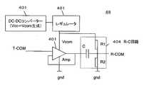 VCOM−ICの構成を、図12に示す。DC−DCコンバーター401及びレギュレーター402は、ロジック電圧VCCから、共通電極信号の電圧Vcomを生成する昇圧回路として構成される。反転アンプ回路403は、透過用共通電極信号T−COMを反転する。反転アンプ回路403にて反転された信号は、センター電圧を調整するためのR−C回路404を介して、反射用共通電極信号R−COMとして出力される。なお、反射用共通電極信号R−COMのセンター電圧は、画素電極信号及び透過用共通電極信号の振幅の中央値と同じ電圧に設定される。  The configuration of the VCOM-IC is shown in FIG. The DC-