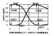 図15は、駆動電圧を変化させたときのVR特性及びVT特性を示している。この特性に対して、Vt(K)=0V、Vr(K)=6Vとして、[6−Vr]−R特性及び[Vt−0]−T特性をプロットすると、図3に示すグラフが得られる。図3を参照すると、特に、黒付近(反射率及び透過率が0の付近)と、白付近(反射率及び透過率が1の付近)において、反射率特性の傾きSr(K)、Sr(W)と、透過率特性の傾きSt(K)、St(W)分だけ、特性がずれていることがわかる。 FIG. 15 shows VR characteristics and VT characteristics when the drive voltage is changed. When the [6-Vr] -R characteristic and the [Vt-0] -T characteristic are plotted with Vt (K) = 0V and Vr (K) = 6V against this characteristic, the graph shown in FIG. 3 is obtained. . Referring to FIG. 3, the slopes Sr (K), Sr () of the reflectance characteristics are particularly near black (the reflectance and transmittance are near 0) and white (the reflectance and transmittance are near 1). It can be seen that the characteristics are shifted by the slopes St (K) and St (W) of the transmittance characteristics.