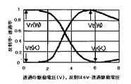 図3では、反転VR特性とVT特性とにおおよその一致は見られるものの、透過モードの見栄えを最適にすると、反射モードの見栄えが白浮きする。そこで、更なる最適化のために、反射領域21におけるくし歯幅wrを3μm,くし歯間隔lrを3.0μmとした。この場合の反転VR特性及びVT特性を、図4に示す。同図を参照すると、図3の場合に比して、反転VR特性とVT特性とが一致しており、反射モードと透過モードでの見栄えがより一致することがわかる。ただし、この場合は、くし歯上の液晶は動かず、くし歯間のみ液晶モードが動くため、反射モードでのコントラストは低下する。  In FIG. 3, although an approximate match is seen between the inverted VR characteristic and the VT characteristic, when the appearance of the transmission mode is optimized, the appearance of the reflection mode becomes white. Therefore, for further optimization, the comb tooth width wr in the