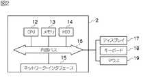 図2に、クライアント装置2のハード構成を示す。クライアント装置2は、CPU(Central Processing Unit)12、メモリ13、HDD(Hard Disk Drive)14、ネットワーク・インタフェース15を内部構成要素として有し、それらが内部バス16で接続されている。さらに、クライアント装置2には、ユーザ・インタフェースとして、ディスプレイ17、キーボード18及びマウス19が接続されている。  FIG. 2 shows a hardware configuration of the