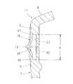 係合爪14は右端壁10の内面を部分的に膨出させて形成したもので、図5に示すように、係合爪14の内面に下から上に向かって内側に傾く傾斜面27を有し、係合爪14の上部に水平な平坦面である係合面28を形成する。傾斜面27は右端壁10の下端部内面側のアール29から段差なく連続一体に斜め上方へ延設される。  The engaging