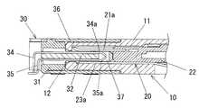 そして、実装基板に固定されたレセプタクル30の前面開口に、上下左右の向きを合わせてプラグ10を挿入すると、プラグ10前面の嵌合穴12内にレセプタクル30の前面0の柱状部32が挿入され、柱状部32の上下両面に露出する信号用コンタクト34,GND用コンタクト35の弾接ばね部34b,35bが、嵌合穴12内部の上下両側面に配設された信号用ポスト21,GND用ポスト23の端子板部21a,23aにそれぞれ内側から弾接することによって、信号用コンタクト34およびGND用コンタクト35が同軸ケーブル100の中心導体101および外周導体102に電気的に接続されるのである。またプラグ10をレセプタクル30に接続した状態では、ロック片41の先端の係合爪41aが金属シェル36のロック孔42に係合することによって、プラグ10の抜けが防止されるようになっている。  Then, when the