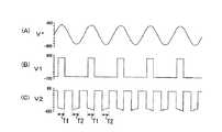 前記第1方形波電圧列の電位を第2基準電位とし、前記第1手段の出力を前記第1周波数より高い第2周波数でチョッピングして電圧レベルが前記正側の第1方形波電圧列より低電圧で前記第2基準電位に対して負側に変化する複数の方形波電圧からなる第2方形波電圧列を生成すると共に、前記第1、第2方形波電圧列を加算することでそれらが前記第1基準電位に対してその正負両側に交互に正弦波的に変化する第3方形波電圧列を形成する第2手段と、