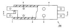 本掛け止め部5の構造は上記図1および図2に示す構造に限定されるものではない。第1リードフレーム1および第2リードフレーム2の外面に設けられ、一次成形樹脂部3からの第1リードフレーム1の離反、および、一次成形樹脂部3からの第2リードフレーム2の離反を防止する機能を有すれば、どの様な形状でもかまわない。  The structure of the