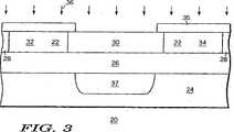 本発明の一実施形態によれば、単結晶シリコン層22および誘電絶縁領域28、30の表面上にフォトレジスト層35が塗布される。このフォトレジスト層は、図3に示すように、誘電絶縁領域30の一部を露出するようにパターニングされる。パターニングされたフォトレジストはイオン注入マスクとして使用され、伝導性を決定するイオン性不純物が矢印36に示すように、単結晶シリコン基板24の表面に注入されて、ドープ領域37が形成される。例えば、N型のドープ領域37を形成するために、約200から300KeVのエネルギーおよび約1×1013から2×1014cm−2の投与量でリンイオンを単結晶シリコン基板に注入することができる。According to one embodiment of the present invention, a