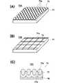ここで、図7、8を参照して、本実施形態に好適なサンプルプレートの態様について説明する。なお、図7、8はサンプルプレートの微小な所定領域に設けられた増強部材72の一部を示すものであり、図7(A),(B)は斜視図、図7(C)は断面図、図8は平面図である。  Here, with reference to FIG. 7, 8, the aspect of the sample plate suitable for this embodiment is demonstrated. 7 and 8 show a part of the reinforcing