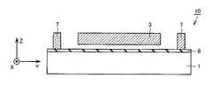 慣性質量体3と下部電極9とは静電容量を構成している。慣性質量体3と下部電極9とは、慣性質量体3の変位によって、静電容量が変化するように構成されている。この静電容量の変化より、基板1の厚み方向(図22中Z軸方向)の加速度が検出される。  The inertial