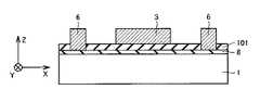 なお、梁部材2が基板1の厚み方向に湾曲した形状に形成される場合には、PSG膜101に段差エッチングが施され得る。また、ポリシリコン膜102が2段に形成され、その間にPSG膜などの犠牲層を形成され得る。これらにより、梁部材2が基板1の厚み方向に湾曲した形状に形成され得る。  When the