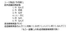 例えば、図8に示すように、ユーザの発話(発話音声)として「今何時?」がマイクロフォン14に入力され、ステップ100において信頼度が高い順に「1.今  なんで」、「2.今  何時」、「3.今  なぜ」、「4.いい  のに」、「5.何  なの」、「6.いま  なんて」の6個の候補が生成された場合には、ステップ106で所定個の候補の各々に対して形態素解析が行われて候補の各々から自立語が抽出される。なお、この場合には、例えば、「今」、「なんで」、「何時」、「なぜ」、「いい」、「何」、及び「なんて」の語が検索語(自立語)として抽出される。そして、ステップ108で検索語を含まない候補が存在しないと判定され、ステップ110で同一の検索語(自立語)毎に検索語の数が特定される。なお、この場合には、「今」の検索語の数として”4”が特定されると共に、「なんで」、「何時」、「なぜ」、「いい」、「何」、及び「なんて」の検索語の各々の数として”1”が特定される。図8の例では、図7の例と同様に、各検索語の右に位置するかっこ内の数値が特定された数を示している。そして、所定値Aを例えば、”4”とし、所定値Bを例えば”1”とした場合には、ステップ112で高信頼度検索語として「今」の検索語が特定され、ステップ114で低信頼度検索語として「なんで」、「何時」、「なぜ」、「いい」、「何」、及び「なんて」の検索語の各々が特定される。そして、ステップ116で高信頼度検索語が特定されたと判定され、ステップ120で低信頼度検索語が多数存在すると判定され、ステップ118で、ユーザに再度の発話を促すための応答内容(例えば、「もう一度お話ください」)が表示装置18及びスピーカ16から応答されるように制御される。このように、ステップ100〜116、120、118の処理によって、入力された音声を棄却する場合に、ユーザに再度の発話を促すことができ、より適切な対応を行うことができる。また、再度の発話を促されたユーザは、次は、より明確に発声するようになったり、言い方を変えてみたりするようになる。  For example, as shown in FIG. 8, “What time is it now?” Is input to the