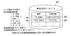また、HDD12bには、図2(B)に示されるような事例応答対データベース22が記憶されている。この事例応答対データベース22には、事例24と、事例24に対応する応答内容26との組が複数個登録されている。本実施の形態では、例えば、統計的に、ユーザの発話内容を表す文章の事例を予め想定しておき、この想定したユーザの発話内容を表す文章の事例を事例24として事例応答対データベース22に予め登録しておく。そして、この事例24に対応する応答内容を予め考えておき、この予め考えられた応答内容を応答内容26として事例応答対データベース22に登録しておく。図2(B)の例では、例えば、「今、何時?」の事例24と、この「今、何時?」に対応する「○時○○分です」の応答内容26との組が事例応答対データベース22に記憶されている。なお、この「○時○○分です」の「○」や「○○」には、「○時○○分です」を応答する際に時刻サーバ(図示しない)等から取得した時刻が入力される。  The
