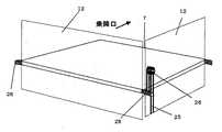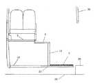 図12・図13は昇降装置床面がバスのトランク床面まで下降する昇降装置のバストランクの構造で、バス前面からの断面図である。昇降装置床面はバスのトランクルーム床面16まで下降し乗降時にはバスのエアーサスペンションのエアーを抜き車高を下げる事により足腰の弱い人や歩行困難な人はより迅速に乗車でき、車椅子仕様の場合はタラップ27の使用で対応する。なお、タラップを使用しないときはトランク床面上部に格納する。  FIGS. 12 and 13 are cross-sectional views from the front of the bus in the structure of the bus trunk of the lifting device in which the floor of the lifting device descends to the floor of the trunk of the bus. The floor of the lifting device descends to the