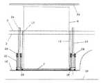 図10・図11は昇降装置床面がバスのトランク床面まで下降する昇降装置のバス側面からの断面図である。駆動はスクリュージャッキ吊り下げ式で昇降装置床面4隅にトラベリング式スクリュージャッキ25を装備し、プーリー26をスクリュージャッキ軸部周囲に配置し、ワイヤーロープを使用して間接式駆動にすることによりコンパクトで安定した作動を可能にした。  10 and 11 are cross-sectional views from the side of the bus of the lifting device in which the lifting device floor is lowered to the trunk floor of the bus. The drive is suspended by a screw jack and is equipped with a traveling