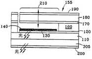 図1に戻ると、発光素子100はまた、OLED105に結合されているMEMS155を含んでいる。MEMSは、スペーサ160によってOLEDから隔設されている。スペーサ160は、MEMSとOLEDとの間に、OLEDに対してMEMSが運動することを可能にする空洞150を形成している。スペーサは次のようにしてOLED上に形成され得る。保護用犠牲金属(図示されていない)又は他の物質の層をOLED105の上面にパターニングして、後のエッチングに備える。OLED上の保護用犠牲物質がエッチングで除去された後にスペーサとして作用するスペーサ物質160の層を保護用犠牲物質に付着させる。このスペーサ物質160は、例えばスキージして平坦化するか、又は他の従来の方法を用いて付着させることができる。スペーサ物質160及び保護用犠牲物質はまた、所望があればフォトイメージ可能な(photoimageable)ポリイミドを含んでいてもよい。