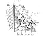 その結果、第1リップ部形成用ブロック材21において、固定ヘッド312と可動ナット314との間の距離21aが、減厚スリット33の先端33aを中心にしてテーパ面214の上下方向214aと平行に広がるので、リップ幅25wが狭まる。  As a result, in the first lip portion forming