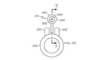 第2の実行例において、図5〜図7の第2代替実施例に示すように、カテーテル212は外部レール242を含み、付属装置214は、コントローラー(図1および図3においてコントローラー50として示されている)の作動中に外部レール242に沿ってスライドするように構成されている。一例において、装置214は、付属作業通路248と遠位付属チューブ部分252とを有する可撓性の付属チューブ246を含み、コントローラー(図1および図3においてコントローラー50として示されている)は、使用者により作動されると、巻線224、226および228に制御可能に電気的に電圧印加して、これにより、カテーテル212が使用者により固定されているときには、遠位付属チューブ部分252を外部レール242に沿ってスライドするように移動させる。  In the second implementation, as shown in the second alternative embodiment of FIGS. 5-7, the