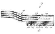 第2の実行例においては、図5〜図7の第2代替実施例に示すように、カテーテル212は外部レール242を含み、付属装置214は、リニアモーター230の動作中に外部レール242に沿ってスライドするように構成されている。一変形例では、装置214は遠位端部244を有し、装置214は、巻線224、226および228を含み、巻線224、226および228は、装置214の遠位端部244に近接して配置される。一例では、装置214は、付属作業通路248を有する可撓性の付属チューブ246を含む。材料の一つの選択において、外部レール242は、内部に埋め込まれた鉄の粒子(明確にするために図7では除いてある)を有するエラストマーを含む。第1の構造例では、装置214は、磁力で外部レール242に連結され、カテーテル212の遠位端部216の停止部(stop)(図示せず)が、付属チューブ246の進行を制限する。図示していない第2の構造例では、装置は、さねはぎ継ぎの配列(tongue and groove arrangement)によって外部レールに連結される。他の連結構造は熟練者に委ねられる。  In the second implementation, as shown in the second alternative embodiment of FIGS. 5-7, the