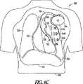 変換器保持リード線306は、左肺204と右肺206の両方の同時流体監視を実施するために、図6Dに示すように、左胸エリアと右胸エリアの両方を含む胸領域内の任意のロケーション上に埋め込まれうる。任意選択で、1つまたは複数の音響変換器プローブ214A、214Bは、肋骨610と肺204、206との間に位置決めされる。この実施例が示すことは、肺流体を監視する音響変換器プローブが、CFMD304の近くかまたは遠くに位置決めされてもよく、音響変換器プローブは、CFMD304に対して、1つまたは複数の変換器保持リード線306などを介して結合されるか、または、変換器とCFMD304との間の無線超音波通信信号を使用することなどによって無線で結合される。有利には、これは、従来的でないCFMD304の場所における音響変換器プローブの考えられる配置を可能にする。音響変換器プローブのロケーションまたは向きは、任意選択で、たとえば、縫合、ヘリカルコイル、バーブ、ティン、クリップ、または同様なものの1つまたは複数あるいは任意の組合せを使用して、あるいは、細胞成長または付着を刺激することがわかっている材料(たとえば、シアノアクリレート接着剤)の外側表面上に接合することによって固定されうる。逆に、薬物溶出性物質または生体適合性コーティングが、変換器保持リード線本体306に沿って配設されて、変換器保持リード線本体306に対する線維性のまたは他の細胞成長を防止しうる。
