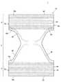 吸収体は、その全体が、ティシュ等の親水性シートによって包み込まれていることが好ましい。このような構成は、吸収体からSAPが漏洩することを防止し、吸収体に形状安定性を付与することができるという利点がある。図6は、吸収体22を上ティシュ52aと下ティシュ52bに包み込んだ例を示す図である。  It is preferable that the absorber is entirely wrapped with a hydrophilic sheet such as tissue. Such a configuration has an advantage that SAP can be prevented from leaking from the absorber and shape stability can be imparted to the absorber. FIG. 6 is a diagram illustrating an example in which the