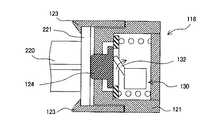 ピストン接触部材124は、平板部とその中央領域に設けられた凸部とを有しており、平板部がピストン押圧部118の中空部内に位置し、かつ凸部が開口部121aを介して押圧部本体121から突出する向きで、矢印M方向に移動自在に設けられている。ピストン押圧部118がピストン部材220を押圧するとき、凸部の先端面が、ピストン部材220の端面すなわちフランジ221を押圧する。  The