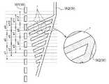 上述したように、学習地物として路面に存在する地物としては、道路の路面に設けられた道路標示も含まれ、その種類は、初期地物と同一のものであってもよい。また、当然、利用頻度が少ない、形状の自由度が大きい、認識対象領域に対して面積が広い、などの理由により初期地物情報として登録されない種類の各種道路標示も含まれる。図8は、進入禁止領域(いわゆるゼブラゾーン)の特徴を認識対象とする例を示した説明図である。ここでは、認識対象となる特徴を「所定領域内の白の面積」とし、認識結果としての特徴量を「所定領域内の白の面積の割合」とする。画像認識部18は、所定の小領域rにおいて白のペイント部Wと路面とが識別可能なように、例えばウインドウコンパレータ処理を実施する。学習地物抽出部31は、小領域r中に所定の割合以上、ペイント部Wが含まれている場合には、学習値を「1」とする。上述したように、学習値は、画像認識に1回成功する毎に、学習データベースDB3における当該認識対象の認識位置が属する位置範囲に加算される。認識位置は、例えば、円形の小領域rの中心とすることができ、当該小領域rの中心が属する位置範囲に学習値が加算される。図9は、図8のようなゼブラゾーンに対する所定の位置範囲毎の学習値の積算例を示す図である。ゼブラゾーンは大きな面積を有しているため、図9に示すように、複数の小領域rにおいて学習値が積算されて、複数の位置範囲において同様の点数で学習しきい値T1を超えることになる。この場合には、例えば、その中間の位置範囲a7を学習地物の位置情報(推測位置pg)としてもよい。  As described above, the features present on the road surface as learning features include road markings provided on the road surface, and the type thereof may be the same as the initial feature. Naturally, various types of road markings that are not registered as initial feature information due to reasons such as low usage frequency, a high degree of freedom in shape, and a large area with respect to the recognition target area are also included. FIG. 8 is an explanatory diagram showing an example in which the characteristics of the entry prohibition area (so-called zebra zone) are recognized. Here, it is assumed that the feature to be recognized is “white area in the predetermined region”, and the feature amount as the recognition result is “ratio of white area in the predetermined region”. The