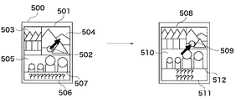 画像枠領域510と文字枠領域511の境界線512の位置は前述された変換法則に従って操作点からの比を一定に保ちながら変動するために、移動後の文字枠領域511は移動前の状態506よりも広くなる。その結果、文字枠領域511内の文字列の自動的な組体裁に変化が可能となり、例えば文字枠領域506では一列表示だったものが文字枠領域511では二列表示に変化する。  Since the position of the