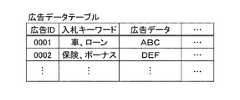 図10を参照して、広告データテーブルについて説明する。広告データテーブルは、広告ID列、入札キーワード列、広告データ列により少なくとも構成されている。広告IDは、図9に示す広告候補情報テーブルにおける広告IDと同様である。入札キーワード列には、広告データを提供する各企業が、広告データを表示させたいキーワードを指定し、そのキーワードが格納される。 The advertisement data table will be described with reference to FIG. The advertisement data table includes at least an advertisement ID column, a bid keyword column, and an advertisement data column. The advertisement ID is the same as the advertisement ID in the advertisement candidate information table shown in FIG. In the bid keyword column, each company providing advertisement data designates a keyword for which the advertisement data is to be displayed, and the keyword is stored.