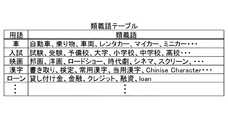 図7を参照して類義語テーブルについて説明する。類義語テーブルは、例えば、用語欄及び類義語欄により構成される。用語欄は、検索対象となる単語であり、この単語に関連する類義語が類義語欄に記憶される。この類義語欄に記憶される単語は、類義語のみならず、例えば、同義語、派生語等を含んでもよい。いわば、類義語テーブルには、類義語辞書としてのデータが記憶される。 The synonym table will be described with reference to FIG. The synonym table includes, for example, a term field and a synonym field. The term column is a word to be searched, and synonyms related to this word are stored in the synonym column. The words stored in the synonym column may include not only synonyms but also synonyms, derivatives, and the like. In other words, data as a synonym dictionary is stored in the synonym table.