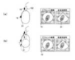 次に、図2は、被検体(頭部) 31が頭部に固定された頭部位置センサ19とともに移動する様子と、その時にモニタ10に写し出されるリファレンス画像と超音波断層像を示した図である。図2において(a)は被検体が動く前、(b)は被検体が動いた後を示している。  Next, FIG. 2 is a diagram showing a state in which the subject (head) 31 moves together with the