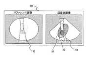すなわち、超音波強度および照射位置(焦点深度、照射角度)と色情報(ビームパターン)との関係は、予めメモリ(図示しない。)に記憶されている。治療位置制御部12からの制御信号はメモリへ伝達され、超音波強度及び照射位置(焦点深度、照射角度)に対応するビームパターンが選択される。そして、選択されたビームパターンは、モニタ10に出力される。モニタ10は、超音波診断装置100から出力される超音波画像と、超音波治療装置101のメモリからの治療ビームパターン33を重ねて表示する。また、モニタ10は、リファレンス画像も同様にしてリファレンス画像算出部3から出力されるリファレンス画像と、超音波治療装置101のメモリからの治療ビームパターン33を超音波画像と共に表示される治療ビームパターン33の表示位置と同じ位置に合わせて表示する。なお、その重ね合わせの際、治療ビームパターン33は半透明に表示させてもよい。  That is, the relationship between ultrasonic intensity, irradiation position (depth of focus, irradiation angle) and color information (beam pattern) is stored in advance in a memory (not shown). A control signal from the treatment