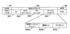 SSは、スーパーフレームの詳細情報フィールドであり、ビーコンを受信した際の時間管理を行うためのビーコン送信間隔やビーコンの通信方式が定義されている。GTSフィールドには、特定の無線端末装置に保障された通信方式(例えば、GTS)の情報が含まれている。PAフィールドには、無線端末装置に送信するデータがある場合、データを送信する無線端末装置を識別する識別情報(ノードアドレス)が含まれている。ビーコンペイロードB24には、拡張シーケンスナンバーB24a、連続ビットB24b、マスクビットB24cが含まれている。 SS is a detailed information field of a superframe, and defines a beacon transmission interval and a beacon communication method for time management when a beacon is received. The GTS field includes information on a communication method (for example, GTS) guaranteed by a specific wireless terminal device. When there is data to be transmitted to the wireless terminal device, the PA field includes identification information (node address) for identifying the wireless terminal device that transmits the data. The beacon payload B24 includes an extended sequence number B24a, continuous bits B24b, and mask bits B24c.