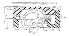 カム120は、図示されているような一実施形態では、往復運動できるように本体部分102aと102bとの間に保持されている。カムカラー136は、トラック140aおよび140bが形成されている概ね平坦な離間した外面142aおよび142bを有する。これらの外面142aおよび142bは、本体部分102aおよび102bに形成されたガイド壁144aと144bとの間に配置されている。カムカラー136は、本体部分102aおよび102bのそれぞれに形成されたガイド148aおよび148b(不図示)によって軸方向の往復運動が案内される対向した溝146aおよび146b(図23を参照)も含む。軸134の上端部および交差部材138は、アクチュエータ半体106aと106bとの間に挟まれて配置されている。各アクチュエータ半体106aおよび106bは、その内面から延びた一対の離間した壁部150aおよび150bによって画定されたカムトラック150を含む。カムトラック150は、アクチュエータ106がピン114を中心に回転する時に交差部材138を受容して案内し、カム120を本体102内において下方に線形に前進させるように構成されている。  In one embodiment as shown, the