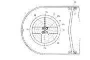 即ち、摺動補助器35は、例えば第2の円板18に形成した円形のレール溝36に沿って円運動可能に設けたC字状の回転板37と、この回転板37に回転自在に設けられた複数のローラ38とからなる。配線ケース13内のFPC板14は、摺動補助器35の内側において芯部材16の周りに巻かれた後、摺動補助器35の内側から外側に出されて摺動補助器35の外側において芯部材16の周りに逆方向に巻かれている。  That is, the sliding assist