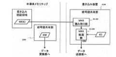 なお、適用可能な暗号化方式は公開鍵方式に限られるものではない。また、以下では、書き込み装置30がデータ変換鍵(秘密鍵Ks)を用いて書込データを暗号化し、半導体メモリチップ10が対応するデータ変換鍵(公開鍵Kp)で書込データを復号してメモリ110に記憶する場合を例に説明する。書き込み装置30がデータ変換鍵(第1鍵)を用いてデータを変換し、半導体メモリチップ10が、第1鍵に対応するデータ変換鍵(第2鍵)を用いて変換後のデータを変換するものであれば、これ以外の変換方法を適用してもよい。例えば、書き込み装置30が第1鍵を用いて復号に相当する変換処理を実行し、半導体メモリチップ10が、第1鍵に対応する第2鍵を用いて暗号化に相当する変換処理を実行するように構成してもよい。  The applicable encryption method is not limited to the public key method. In the following, the