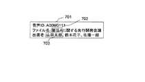 本実施形態では、音声データ101として会議録音声を用いる。会議録音声には図12のように、それぞれファイル名702と出席者名703と音声ID701が付与されている。この音声データ101に対して形態素解析処理を行うことにより、「製品A」702や、「山田太郎」703といった単語を抽出することができる。以下では、形態素解析処理によって音声データ101から抽出した単語をメタデータ単語列102として利用する例を示す。なお、会議録音声収録時にファイル名もしくは出席者名を発声しておき、当該発話を前期第1実施形態に示した音声認識処理によって単語列に変換することでファイル名702と出席者名703を抽出し、上記と同様の処理でメタデータ単語列102を抽出することも可能である。  In the present embodiment, conference audio is used as the