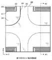 各第1の凹部24と第2の凹部25との境界26は、図4及び図5に示すように、その一部が曲線形状になっている。即ち、第2の凹部25は、ストッパ板裏面において梁部13に対向する位置に所定の幅を有するほぼ十字形に形成され、この十字形の中央部分と各第1の凹部24との境界26が、錘部11を構成する周辺質量部11bの一部を通る曲線形状になっている。上面から見た場合のこの曲線形状は、周辺質量部11bにおける中央質量部11aから最も離れた角部に隣接した二つの角部近傍に対応する位置を通る曲線であって、中央質量部11a側に突出する弧状になっている。又、十字形の端部の幅は、隣接する周辺質量部11bの間隔よりも広く設けられている。かかる形状によって境界26は構成されている。  As shown in FIGS. 4 and 5, a part of the